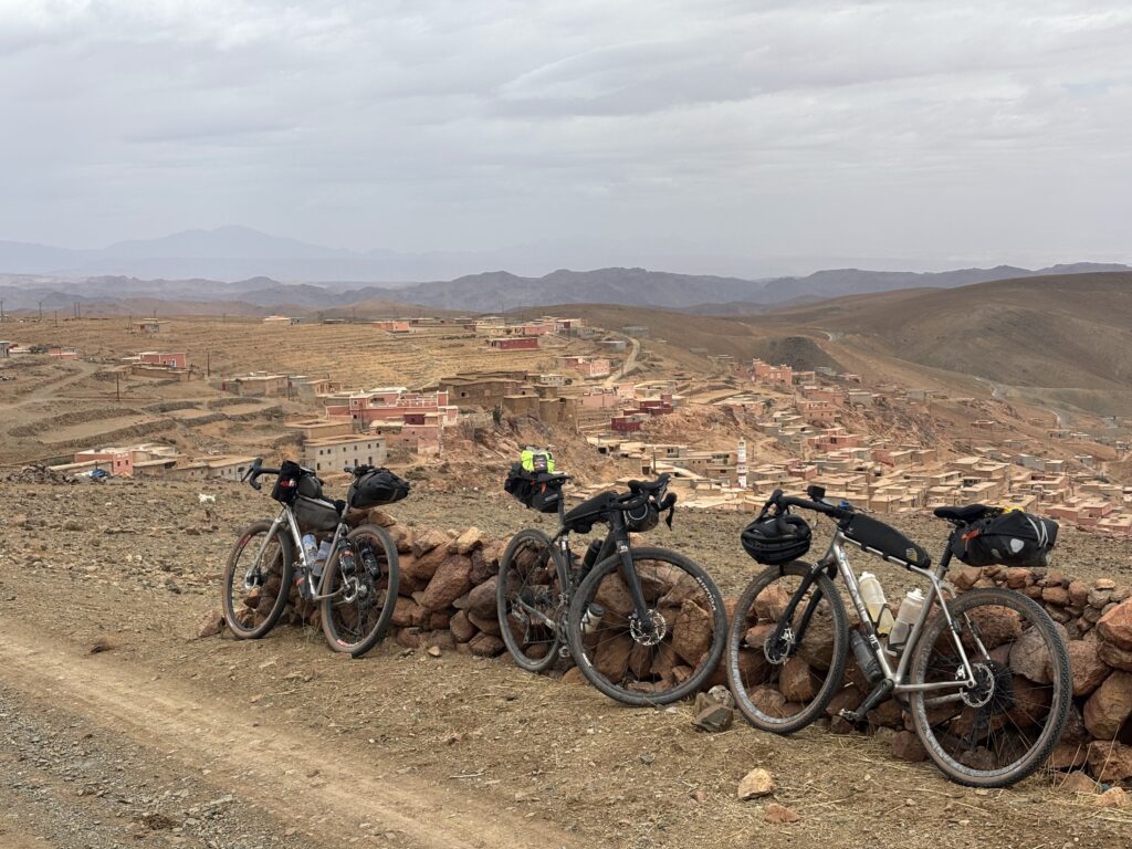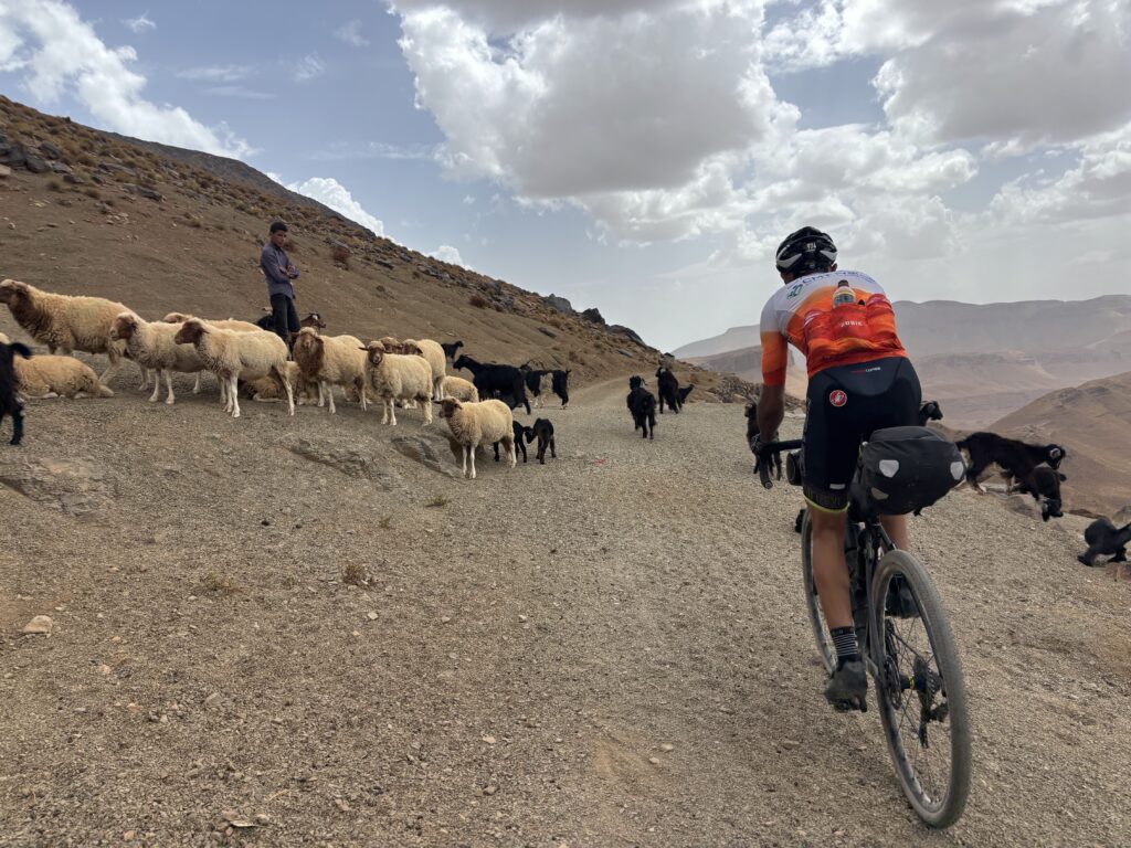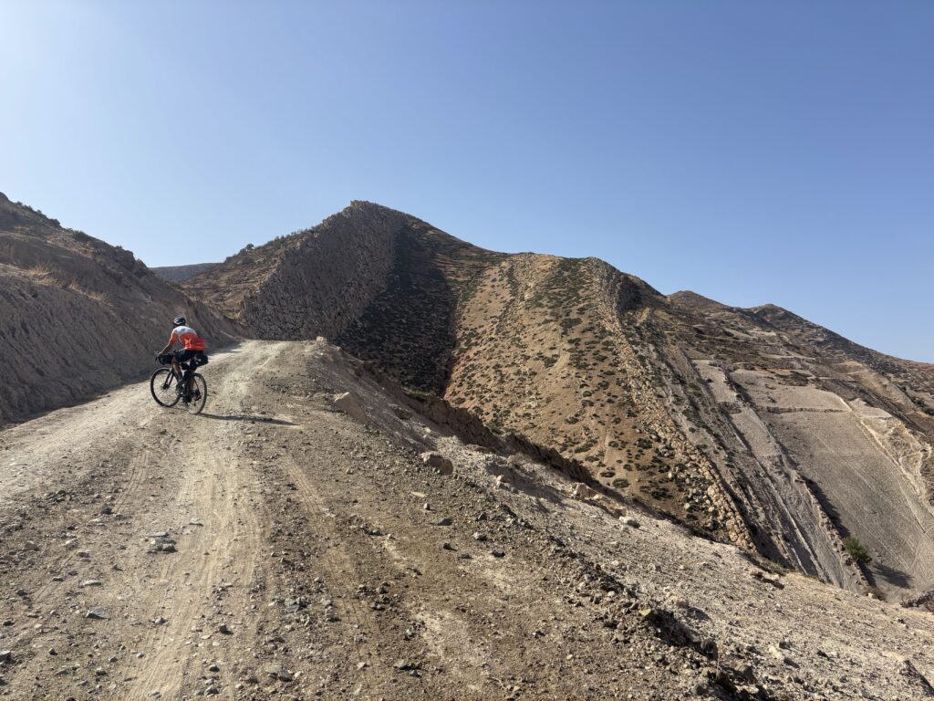 À l’aube, nous nous attaquons au massif du Sagho et au col du Tizi n’Tazazert, la piste est splendide. Des jeunes du coin nous accompagnent sur des vélos sans freins, freinant avec leurs sandales – parfois avec une seule ! Ils nous demandent des bonbons, stylo ou de l’argent… Nous partageons quelques chips avec eux au sommet 🍟.