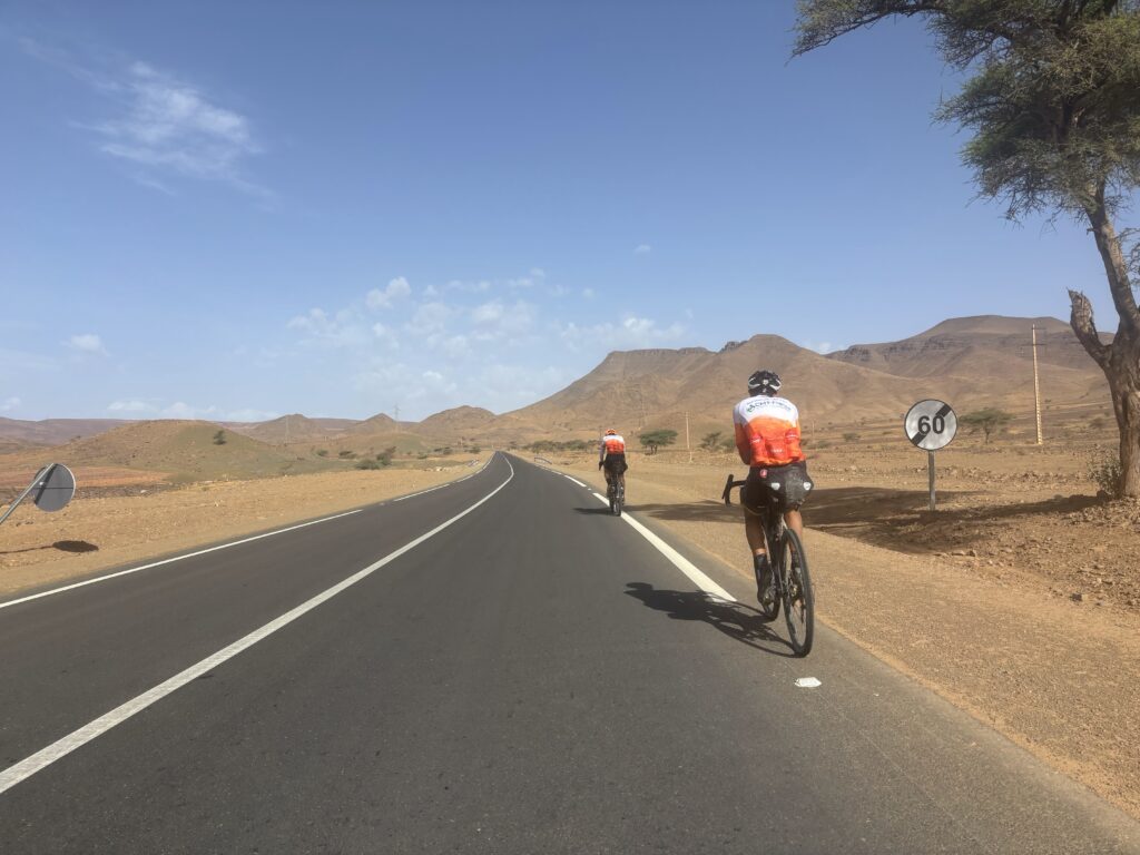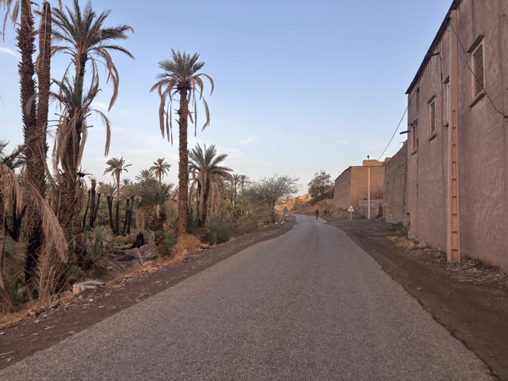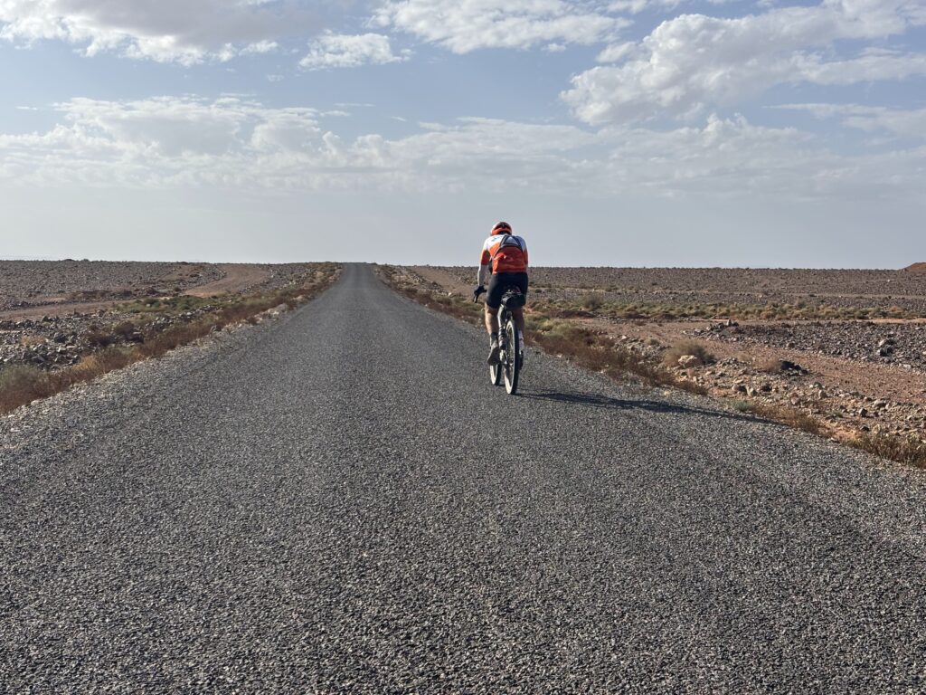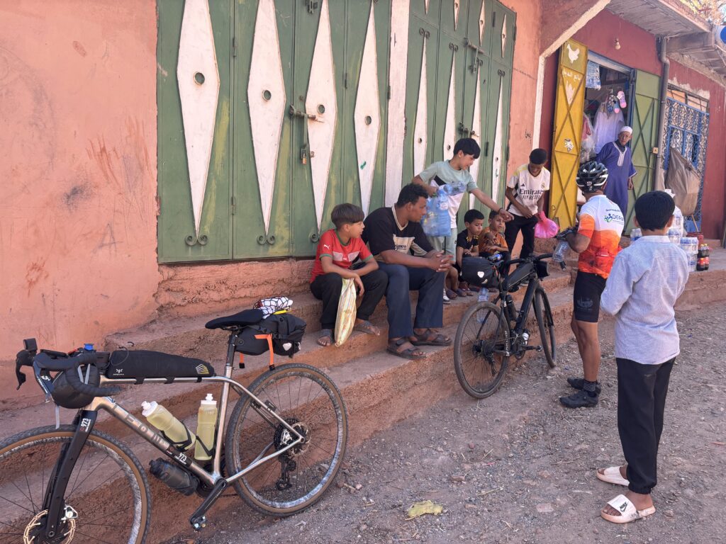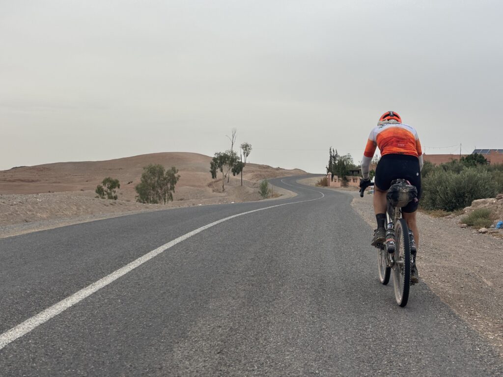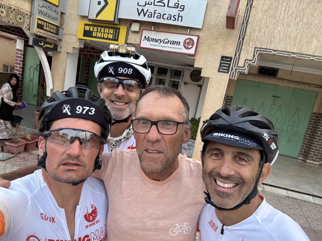 Amochés par la chaleur et la fatigue, nous approchons de Marrakech. À Ouzguina, plus que 50 km… et une belle surprise : Christian nous attend, sourire immense 😃. Sa présence nous redonne de l’énergie. Il ouvre la route pour la dernière ligne droite.