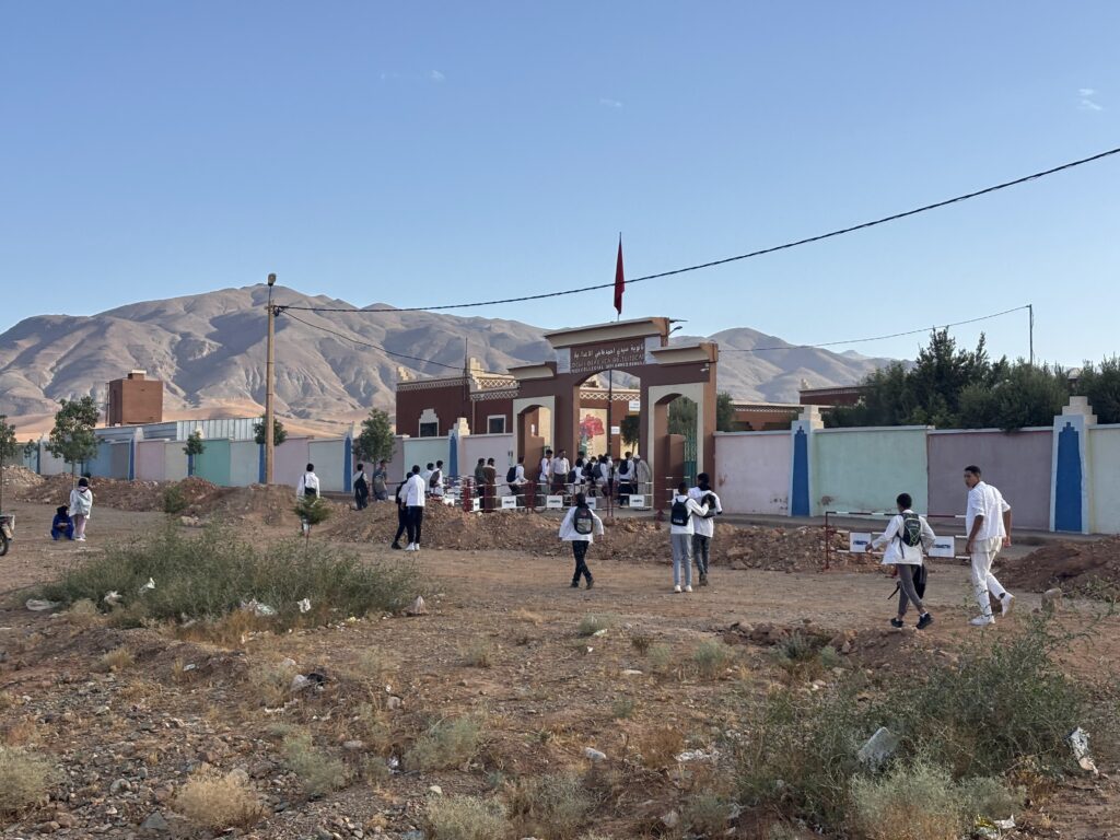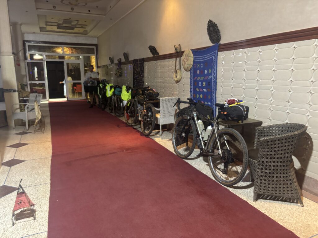 La nuit se passe finalement à Taznakht : l’organisation nous déconseille de franchir la portion de montagne en gravel sous l’orage nocturne. Hébergement miteux, mais sécurité assurée 🛏️.