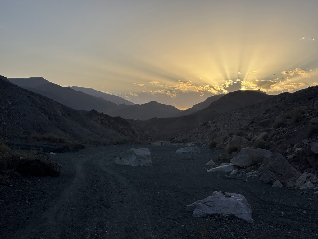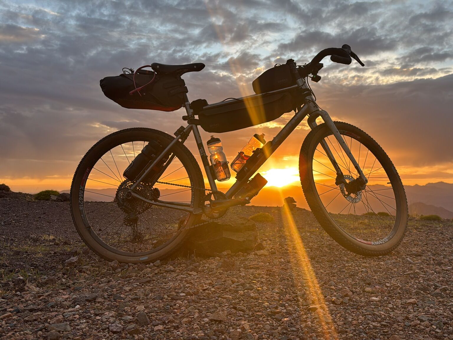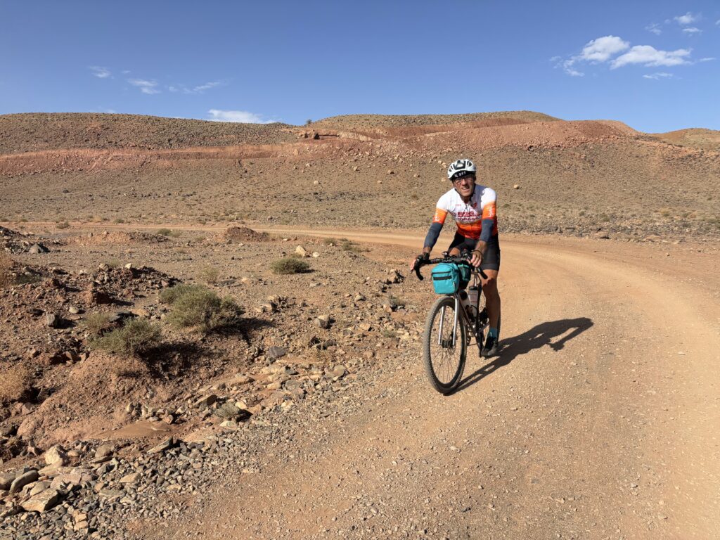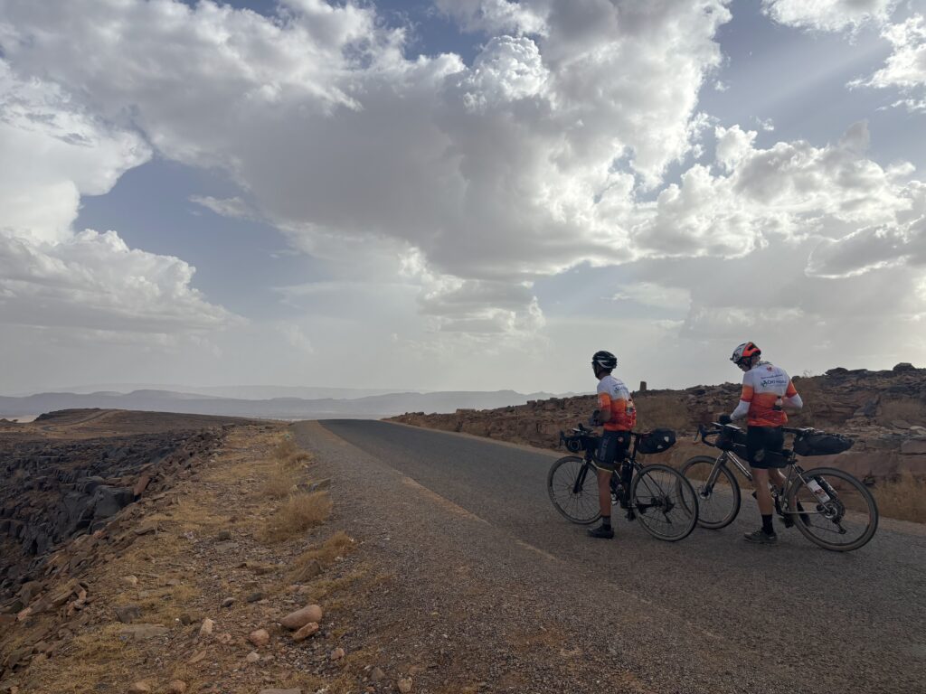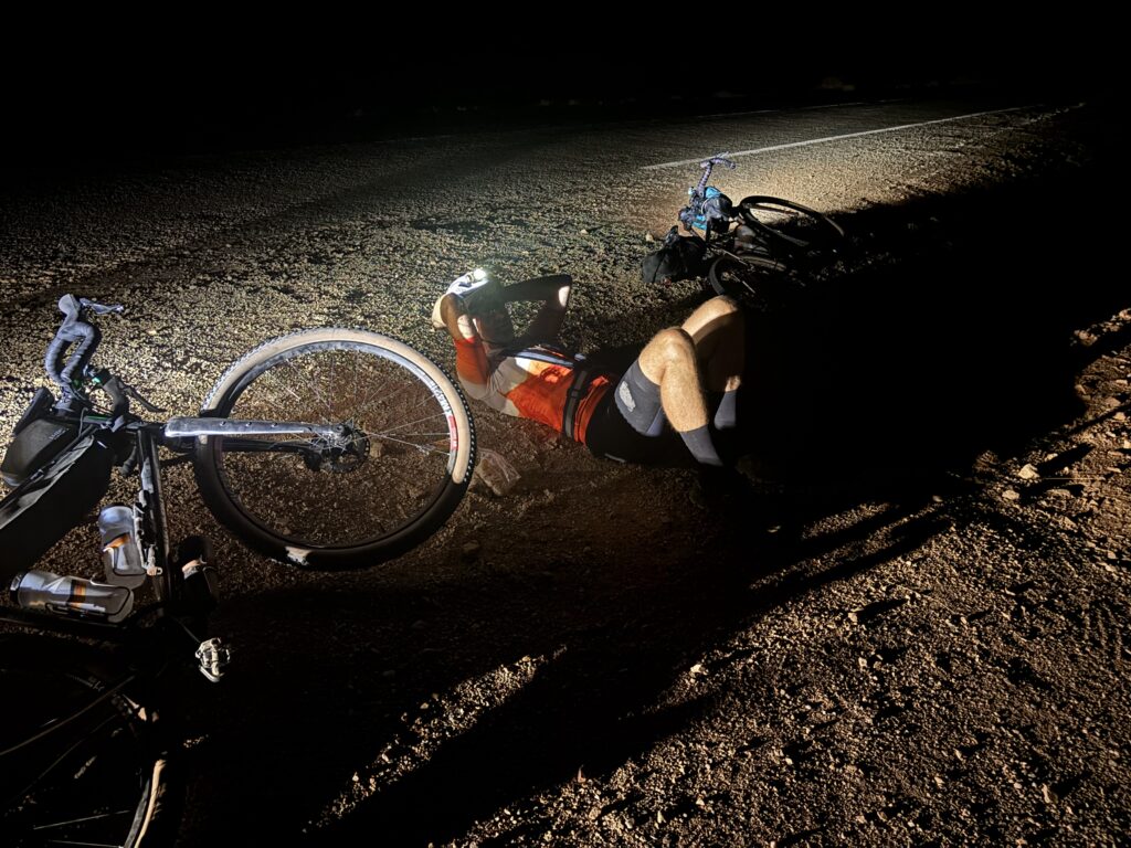 Réveil à 2h30 pour attaquer une portion de gravel exigeante. Entre navigation compliquée et fatigue, Mathieu chute presque à l’arrêt : plus de peur que de mal, mais une douleur à l’épaule qui le suivra jusqu’à l’arrivée. Au lever du soleil, nous totalisons 200 km, dans un décor de pierres et de reliefs rugueux et sabloneux 🌄.