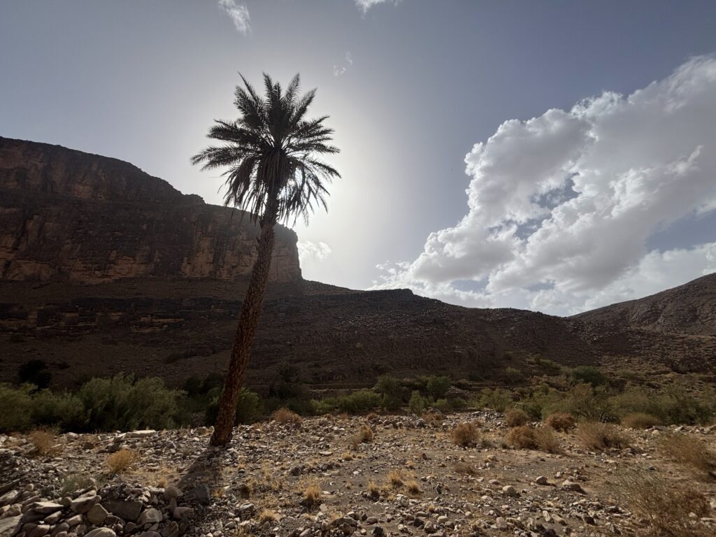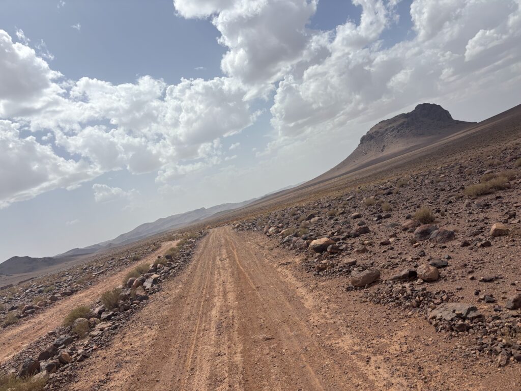 À Agdz, le col du Tizi n’Tinififft nous attend, sous 39 °C 🥵. Une omelette et une courte sieste suffisent à relancer la machine avant 50 km de piste désertique. La chaleur est accablante, puis le vent se lève, des orages grondent au loin. Heureusement, seules quelques gouttes tombent et nous rafraîchissent.